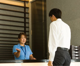 管理員はマンションに駐在し、マンション管理の実務を行います。穴吹コミュニティでは、管理員がご入居者様の暮らしのそばで、つねに心地よい住環境づくりのサポートにあたります。管理員業務には受付業務、点検業務、立会業務、報告連絡業務のほか、日常清掃業務*も担当します。穴吹コミュニティでは定期的に社内研修を開催し、質の高い管理員の育成に力を注いでいます。基本的なマナーはもちろん、応用的な点検業務までこなせる人材を育成し、実務のクオリティアップを図っています。